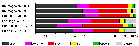 | Kreistagswahl 2004 | 47,2 | 41,1 | 12,0 | 39,2 | 3,8 | 2,4 | 1,5 | |
