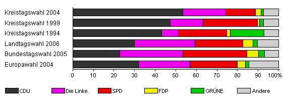 | Kreistagswahl 2004 | 46,2 | 53,4 | 20,8 | 14,6 | 2,5 | 1,4 | 7,3 | |