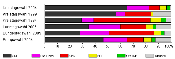| Kreistagswahl 2004 | 44,4 | 65,0 | 17,7 | 8,3 | 5,2 | 3,1 | 0,6 | |
