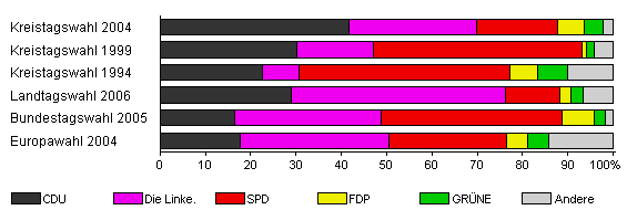 | Kreistagswahl 2004 | 61,2 | 41,6 | 28,3 | 17,9 | 5,7 | 4,3 | 2,2 | |