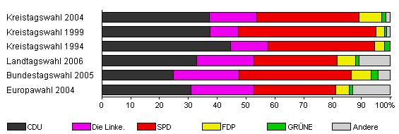 | Kreistagswahl 2004 | 44,0 | 37,3 | 16,5 | 35,4 | 7,9 | 1,3 | 1,5 | |