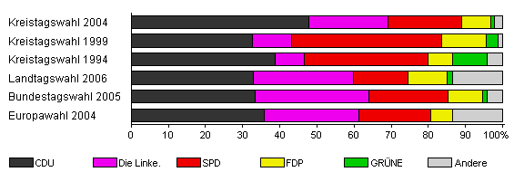 | Kreistagswahl 2004 | 86,0 | 47,7 | 21,3 | 19,9 | 7,9 | 0,9 | 2,3 | |
