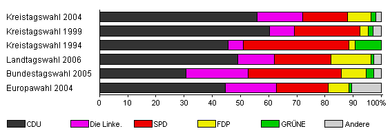 | Kreistagswahl 2004 | 49,0 | 55,8 | 16,2 | 15,9 | 8,5 | 1,7 | 1,8 | |