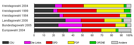 | Kreistagswahl 2004 | 54,1 | 21,4 | 7,2 | 22,3 | 41,8 | 2,4 | 4,9 | |