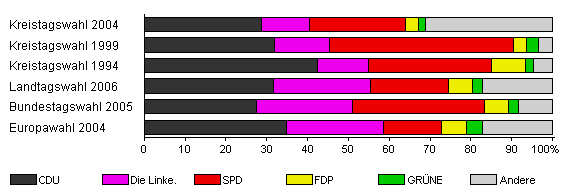 | Kreistagswahl 1999 | 66,5 | 32,0 | 13,3 | 45,1 | 3,3 | 2,8 | 3,4 | |