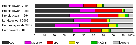 | Kreistagswahl 2004 | 68,8 | 34,7 | 14,7 | 13,7 | 5,7 | 1,4 | 29,9 | |