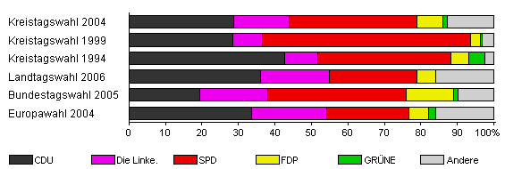 | Kreistagswahl 2004 | 71,1 | 28,8 | 15,1 | 34,9 | 7,3 | 1,2 | 12,7 | |