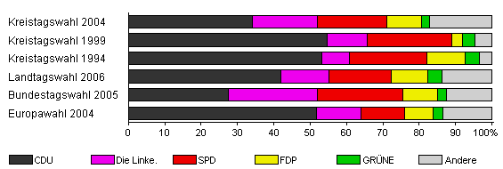 | Kreistagswahl 2004 | 66,9 | 34,2 | 17,7 | 19,2 | 9,4 | 2,3 | 17,1 | |