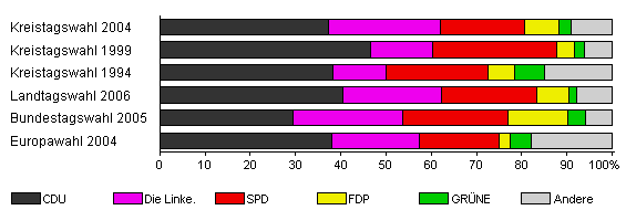 | Kreistagswahl 2004 | 76,7 | 37,2 | 24,7 | 18,8 | 7,5 | 2,6 | 9,3 | |