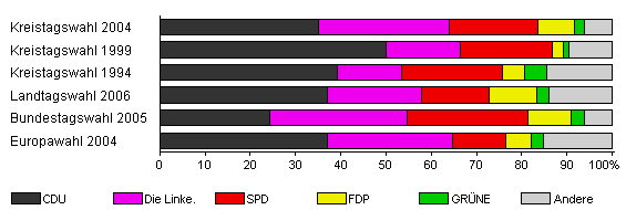 | Kreistagswahl 2004 | 66,8 | 35,0 | 28,9 | 19,6 | 8,1 | 2,3 | 6,1 | |