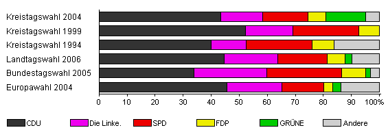 | Kreistagswahl 2004 | 56,8 | 43,5 | 14,8 | 16,1 | 6,4 | 14,2 | 4,8 | |