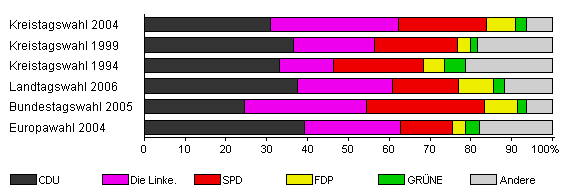 | Kreistagswahl 2004 | 67,3 | 30,8 | 31,5 | 21,5 | 7,0 | 2,8 | 6,5 | |