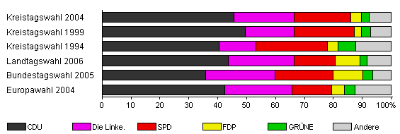 | Kreistagswahl 2004 | 54,7 | 45,5 | 21,0 | 19,5 | 3,6 | 2,8 | 7,5 | |
