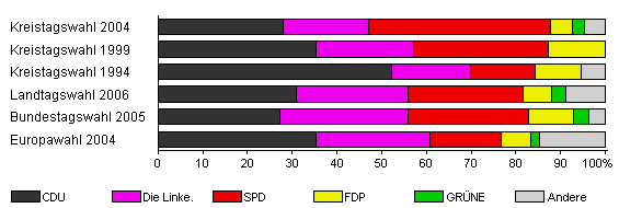 | Kreistagswahl 2004 | 48,6 | 27,9 | 19,2 | 40,6 | 5,0 | 2,5 | 4,8 | |
