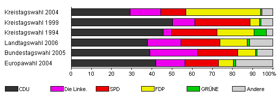 | Kreistagswahl 1994 | 82,1 | 45,5 | 4,2 | 22,6 | 18,3 | 6,2 | 3,3 | |