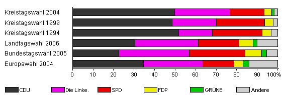 | Kreistagswahl 2004 | 43,3 | 49,8 | 26,8 | 16,7 | 3,7 | 1,3 | 1,7 | |