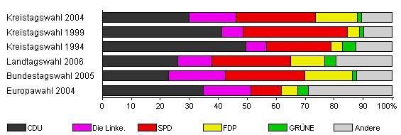 | Kreistagswahl 2004 | 71,1 | 29,9 | 16,2 | 27,5 | 14,3 | 1,6 | 10,5 | |