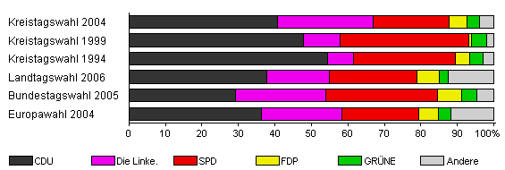 | Kreistagswahl 2004 | 66,5 | 40,8 | 26,2 | 20,7 | 4,9 | 3,4 | 3,9 | |
