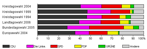 | Kreistagswahl 2004 | 76,1 | 40,5 | 19,9 | 18,7 | 8,5 | 3,1 | 9,3 | |