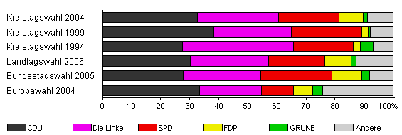 | Kreistagswahl 2004 | 63,0 | 32,5 | 28,1 | 20,8 | 8,2 | 1,6 | 8,9 | |