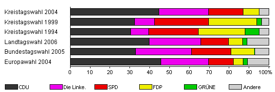 | Kreistagswahl 2004 | 67,3 | 44,6 | 24,9 | 17,6 | 7,9 | - | 5,0 | |