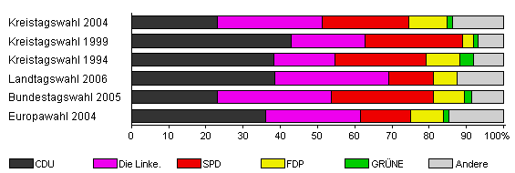 | Kreistagswahl 2004 | 66,5 | 23,0 | 28,2 | 23,4 | 10,1 | 1,6 | 13,8 | |