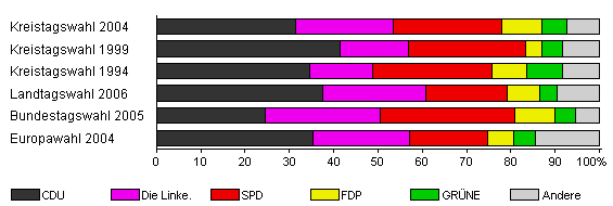 | Kreistagswahl 2004 | 57,8 | 31,5 | 22,0 | 24,4 | 9,0 | 5,7 | 7,4 | |