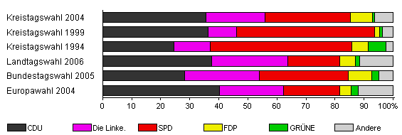 | Kreistagswahl 2004 | 66,7 | 35,5 | 20,4 | 29,4 | 7,5 | 0,9 | 6,3 | |