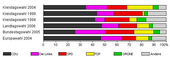 | Kreistagswahl 2004 | 71,2 | 34,4 | 17,2 | 16,4 | 21,1 | 4,4 | 6,4 | |