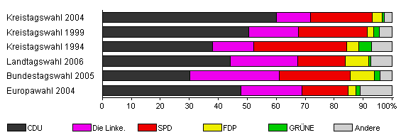 | Kreistagswahl 2004 | 49,1 | 60,0 | 11,9 | 21,3 | 3,4 | 0,7 | 2,7 | |