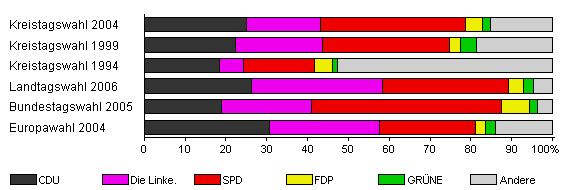| Kreistagswahl 2004 | 69,5 | 25,1 | 18,0 | 35,6 | 4,1 | 2,0 | 15,3 | |