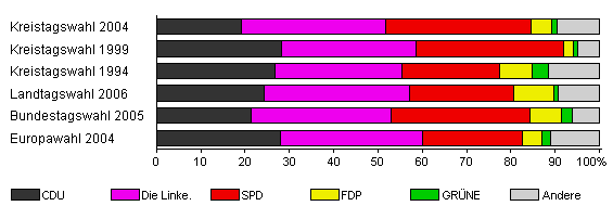 | Kreistagswahl 2004 | 67,1 | 19,2 | 32,4 | 32,9 | 4,7 | 1,3 | 9,5 | |