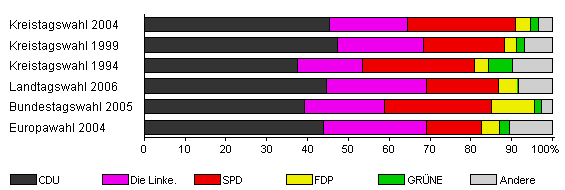| Kreistagswahl 2004 | 56,5 | 45,4 | 19,1 | 26,4 | 3,8 | 1,8 | 3,6 | |