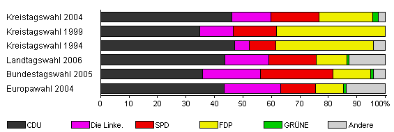 | Landtagswahl 2006 | 55,8 | 43,7 | 15,3 | 16,8 | 10,8 | 0,7 | 12,7 | |