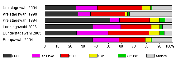 | Kreistagswahl 1999 | 64,9 | 26,0 | 9,9 | 27,0 | 2,1 | 1,4 | 33,5 | |