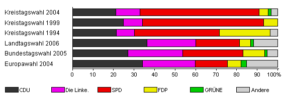 | Kreistagswahl 2004 | 56,9 | 21,2 | 11,7 | 58,1 | 4,3 | 1,6 | 3,0 | |