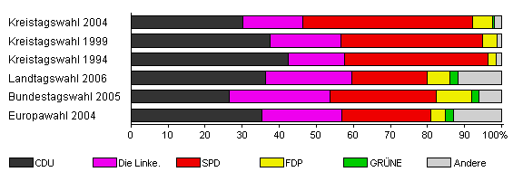 | Kreistagswahl 2004 | 44,4 | 30,1 | 16,3 | 45,7 | 5,3 | 0,7 | 2,0 | |