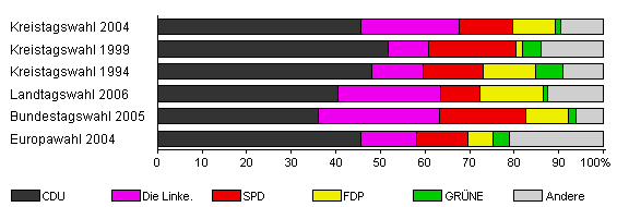 | Kreistagswahl 2004 | 74,1 | 45,6 | 22,1 | 11,9 | 9,6 | 1,2 | 9,6 | |