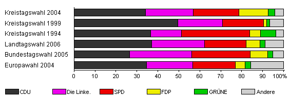 | Kreistagswahl 2004 | 63,9 | 34,1 | 22,7 | 21,8 | 14,1 | 3,0 | 4,3 | |