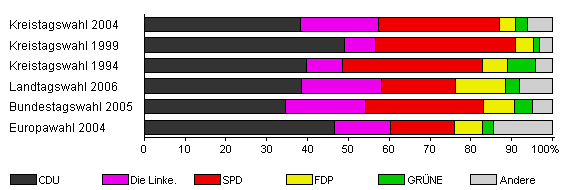 | Kreistagswahl 2004 | 75,9 | 38,2 | 19,2 | 29,5 | 4,1 | 2,9 | 6,1 | |