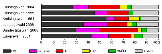 | Kreistagswahl 2004 | 71,9 | 26,4 | 13,9 | 26,4 | 6,4 | 3,8 | 23,2 | |