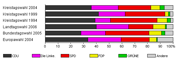 | Kreistagswahl 1994 | 80,3 | 38,9 | 12,0 | 36,6 | 7,7 | 2,8 | 2,0 | |