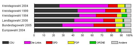| Kreistagswahl 2004 | 65,5 | 25,9 | 50,5 | 9,7 | 7,3 | 0,8 | 5,7 | |