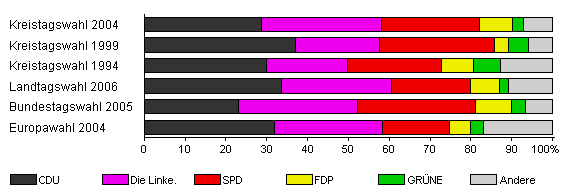 | Kreistagswahl 2004 | 55,3 | 28,6 | 29,4 | 24,2 | 7,9 | 2,8 | 7,1 | |