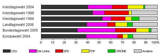 | Landtagswahl 2006 | 55,2 | 39,3 | 17,8 | 6,5 | 10,3 | 4,7 | 21,5 | |