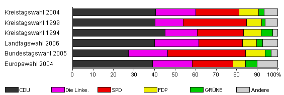 | Kreistagswahl 2004 | 63,3 | 40,4 | 19,6 | 21,2 | 9,4 | 2,7 | 6,7 | |