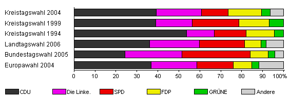 | Kreistagswahl 2004 | 44,3 | 39,3 | 21,5 | 12,6 | 16,1 | 4,1 | 6,4 | |