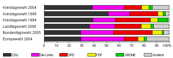 | Kreistagswahl 2004 | 46,4 | 38,5 | 25,4 | 14,0 | 5,8 | 2,7 | 13,6 | |