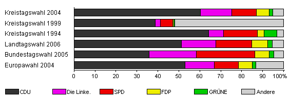 | Kreistagswahl 2004 | 49,2 | 60,2 | 15,1 | 11,8 | 5,9 | 1,9 | 5,1 | |