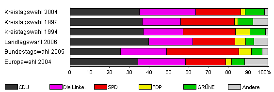 | Kreistagswahl 2004 | 41,8 | 35,1 | 28,3 | 22,9 | 2,2 | 9,7 | 1,8 | |
